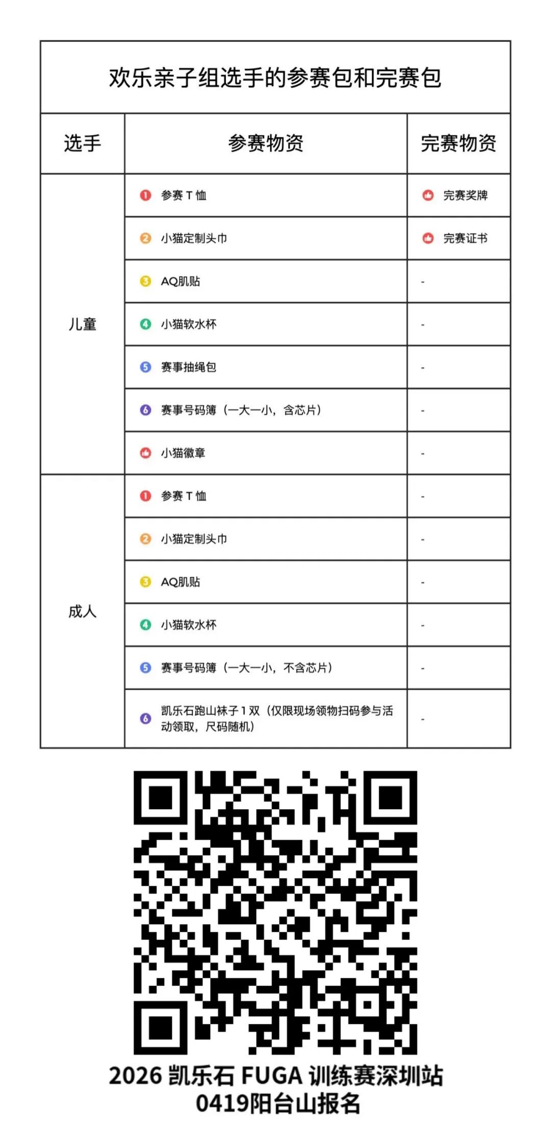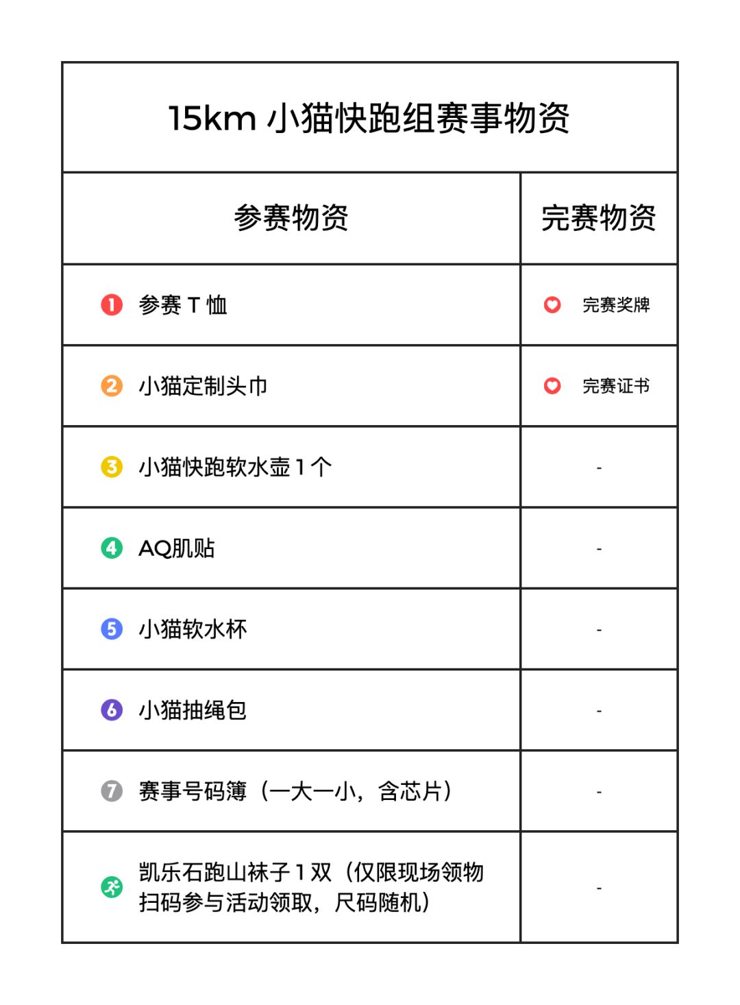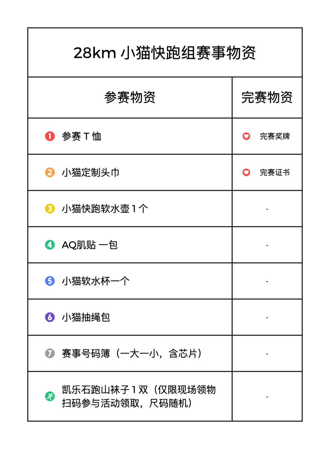 赛事物资包括参赛包、参赛T恤、定制头巾、AQ肌贴、以及赛后发放的完赛奖牌、完赛证书、完赛服等。